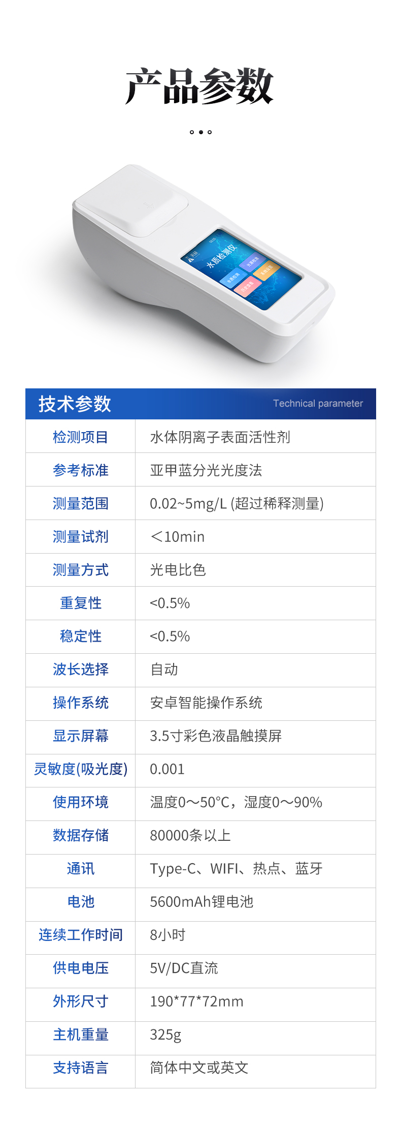 | 檢測項(xiàng)目:水體陰離子表面活性劑; | 參考標(biāo)準(zhǔn):亞甲藍(lán)分光光度法; | 測量范圍:0.02~5mg/L (超過稀釋測量); | 測量時間:<10min; | 測量方式:光電比色; | 重復(fù)性:<0.5%; |