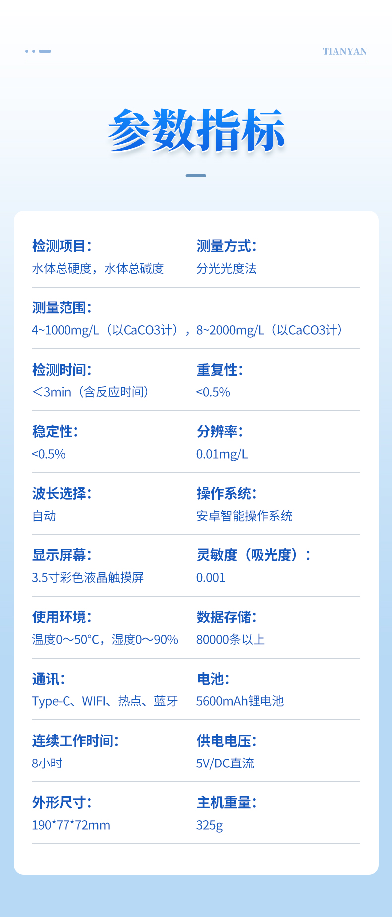 | 檢測項(xiàng)目:水體總硬度,水體總堿度; | 測量范圍:4~1000mg/L(以CaCO3計(jì)),8~2000mg/L(以CaCO3計(jì)); | 測量方式:分光光度法; | 檢測時(shí)間:<3min(含反應(yīng)時(shí)間); | 重復(fù)性:<0.5%; | 穩(wěn)定性:<0.5%; |