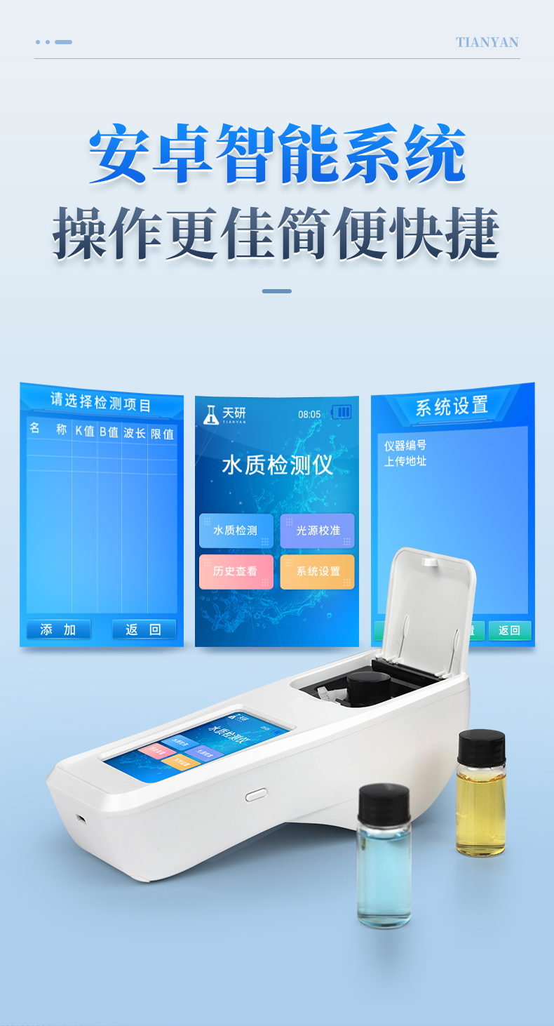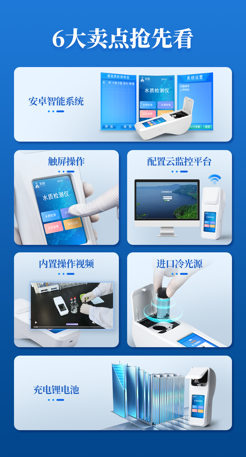 | 1、安卓智能系統(tǒng),操作更佳簡便快捷; | 2、配置云監(jiān)控平臺(tái),檢測結(jié)果可直接無線傳至平臺(tái),進(jìn)行水質(zhì)長短期分析,輔助管理; | 3、內(nèi)置操作流程、操作簡單、無需培訓(xùn)、直接上手; | 4、檢測速度更快,現(xiàn)場讀取數(shù)據(jù); | 5、便攜式體積小,重量輕,方便戶外檢測; | 6、外形小巧美觀,工作穩(wěn)定免維護(hù),具有較好的性價(jià)比; | 7、采用進(jìn)口冷光源,光學(xué)性能穩(wěn)定,壽命長達(dá)10萬小時(shí); | 8、交直流兩用,內(nèi)置充電鋰電池,環(huán)保耐用可支持連續(xù)室內(nèi)外工作。 |
