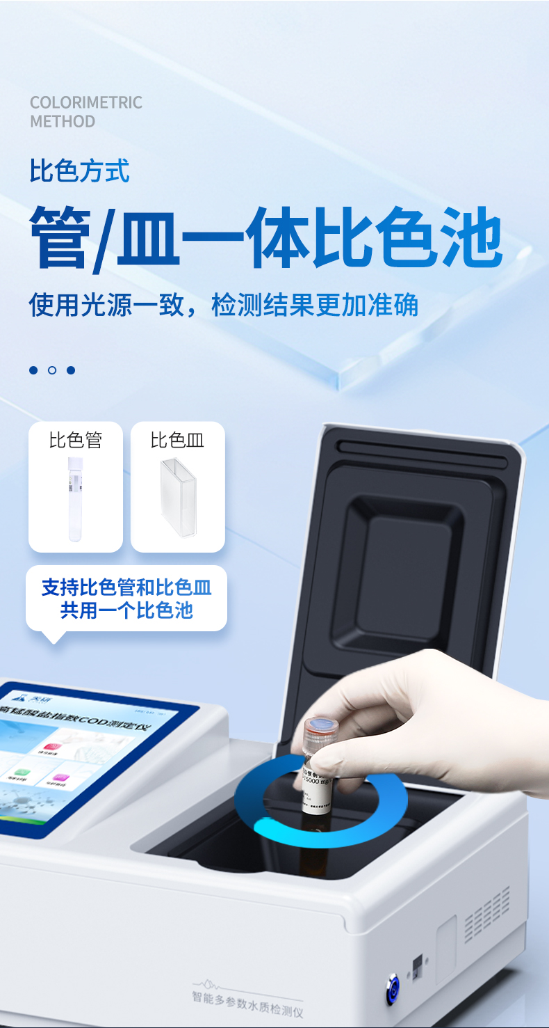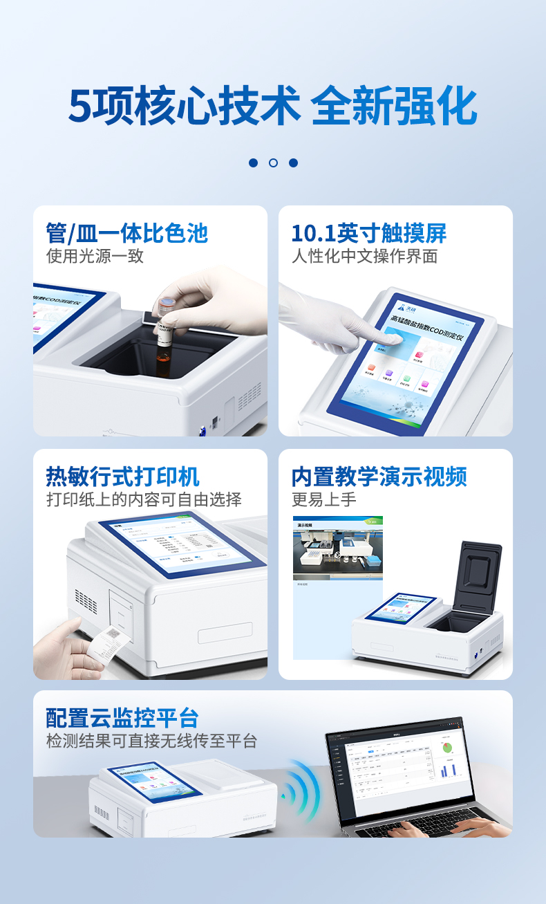 | 1、采用全新安卓7.1.1智能操作系統(tǒng),人性化中文操作界面,運(yùn)轉(zhuǎn)速度更快速,穩(wěn)定性更強(qiáng)。 | 2、10.1英寸液晶觸摸屏顯示,人性化中文操作界面,讀數(shù)直觀、簡單。 | 3、采用精密比色池設(shè)計(jì),使用光源一致,可以解決由于光源誤差帶來的檢測結(jié)果誤差問題,檢測結(jié)果更加精準(zhǔn)。 | 4、光源采用進(jìn)口超高亮發(fā)光二極管,光源亮度可以自動(dòng)調(diào)節(jié)與校準(zhǔn)。 | 5、支持10mm、30mm、50mm皿比色和φ16mm管比色等比色方式,多元選擇,確保測量的準(zhǔn)確性; | 6、具有無線通訊功能,支持WIFI、RJ45、手機(jī)熱點(diǎn)聯(lián)網(wǎng)傳輸,檢測數(shù)據(jù)亦可通過U盤導(dǎo)出; | 7、多功能樣品管理,可對樣品進(jìn)行中英文命名,方便樣品記錄和數(shù)據(jù)存儲; | 8、儀器可永久存儲800萬組數(shù)據(jù),為方便大量數(shù)據(jù)查找,可通過時(shí)間檢索,并隨意選擇分析; | 9、儀器帶有監(jiān)管云平臺,數(shù)據(jù)可通過局域網(wǎng)和互聯(lián)網(wǎng)上傳,亦可對接上傳至環(huán)境監(jiān)管部門平臺。 | 10、內(nèi)置熱敏行式打印機(jī),打印紙上的內(nèi)容可自由選擇(包括二維碼打?。?/td> | 12、內(nèi)置教學(xué)演示視頻,用戶可一邊看儀器內(nèi)操作視頻,一邊進(jìn)行實(shí)驗(yàn)操作,更易上手。 | 13、后期產(chǎn)品固件可升級。 |