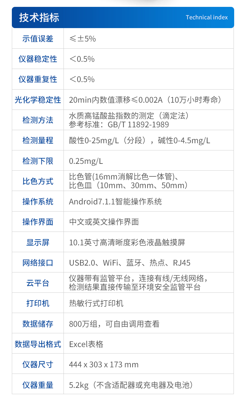 | 比色方式:比色管(16mm消解比色一體管)、比色皿(10mm、30mm、50mm); | 操作系統(tǒng):Android7.1.1智能操作系統(tǒng); | 操作界面:中文或英文操作界面; | 顯示屏:10.1英寸高清晰度彩色液晶觸摸屏; | 網(wǎng)絡(luò)接口:USB2.0、WiFi、藍(lán)牙、熱點(diǎn)、RJ45; | 云平臺:儀器帶有監(jiān)管平臺,連接有線/無線網(wǎng)絡(luò),檢測結(jié)果直接傳輸至環(huán)境安全監(jiān)管平臺; | 打印機(jī):熱敏行式打印機(jī); | 數(shù)據(jù)儲存:800萬組,可自由調(diào)用查看; | 數(shù)據(jù)導(dǎo)出格式:Excel表格; | 儀器尺寸:444 x 303 x 173 mm; | 儀器重量:5.2kg(不含適配器或充電器及電池); |