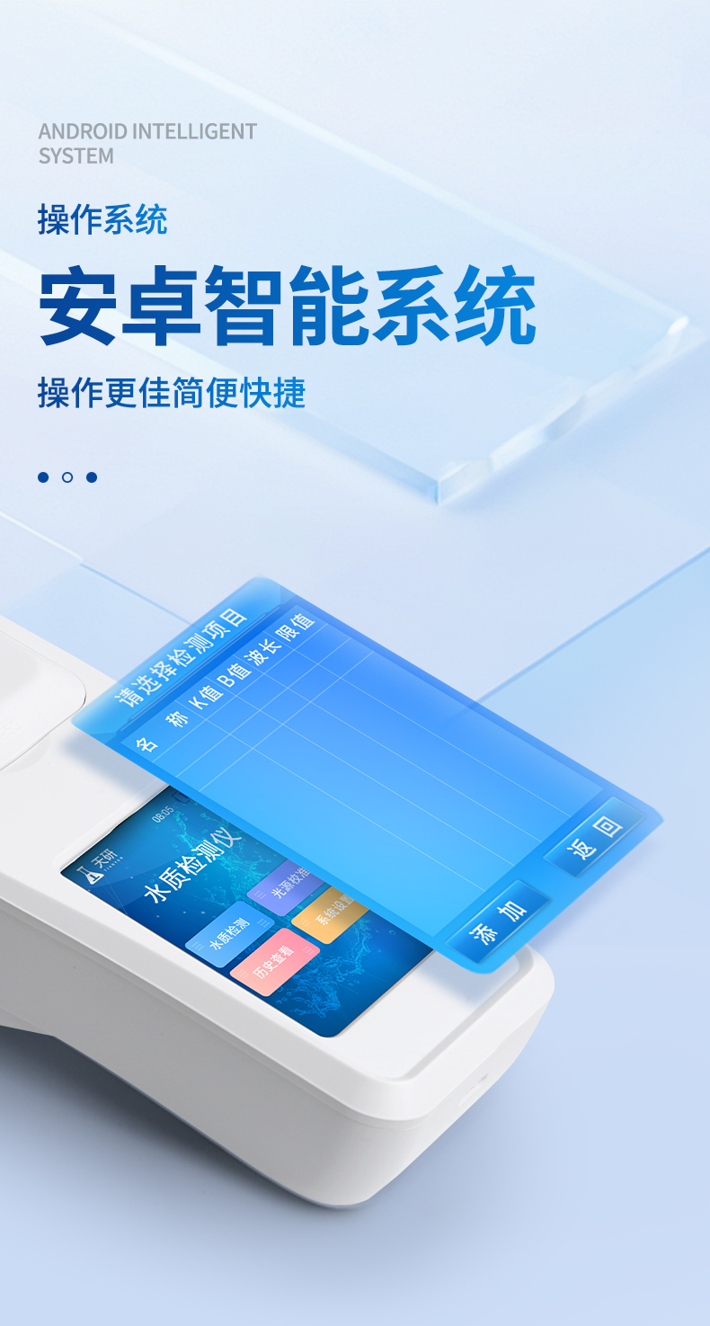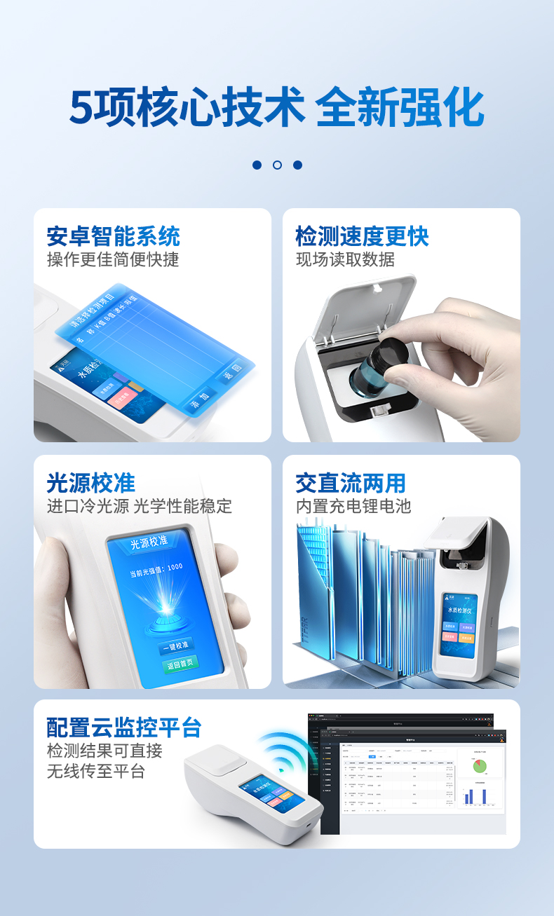 | 1、安卓智能系統(tǒng),操作更佳簡便快捷; | 2、配置云監(jiān)控平臺,檢測結(jié)果可直接無線傳至平臺,進(jìn)行水質(zhì)長短期分析,輔助管理。 | 3、內(nèi)置操作流程、操作簡單、無需培訓(xùn)、直接上手; | 4、檢測速度快,現(xiàn)場讀取數(shù)據(jù) | 5、便攜式體積小,重量輕,方便戶外檢測 | 6、外形小巧美觀,工作穩(wěn)定免維護(hù),具有較好的性價比 | 7、采用進(jìn)口冷光源,光學(xué)性能穩(wěn)定,壽命長達(dá)10萬小時 | 8、交直流兩用,內(nèi)置充電鋰電池,環(huán)保耐用可支持連續(xù)室內(nèi)外工作。 |