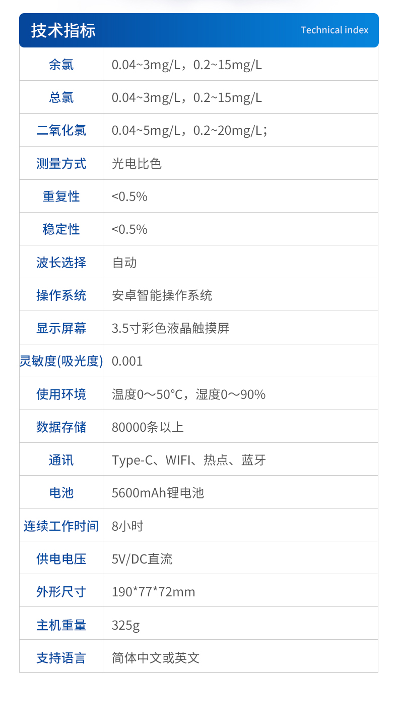 | 余氯:0.04~3mg/L,0.2~15mg/L; | 總氯:0.04~3mg/L,0.2~15mg/L; | 二氧化氯:0.04~5mg/L,0.2~20mg/L; | 測量方式:光電比色 | 重復(fù)性:<0.5%> | 穩(wěn)定性:<0.5%> | 波長選擇:自動 | 操作系統(tǒng):安卓智能操作系統(tǒng) | 顯示屏幕:3.5寸彩色液晶觸摸屏 | 靈敏度(吸光度):0.001 | 使用環(huán)境:溫度0~50℃,濕度0~90% | 數(shù)據(jù)存儲:80000條以上 | 通訊:Type-C、WIFI、熱點(diǎn)、藍(lán)牙 | 電池:5600mAh鋰電池 | 連續(xù)工作時間:8小時 | 供電電壓:5V/DC直流 | 外形尺寸:190*77*72mm | 支持語言:簡體中文或英文 | 主機(jī)重量:325g | 儀器包裝尺寸:350*150*300mm | 包裝重量:2kg |