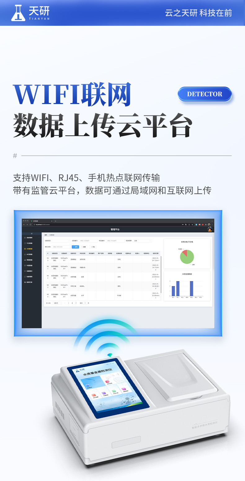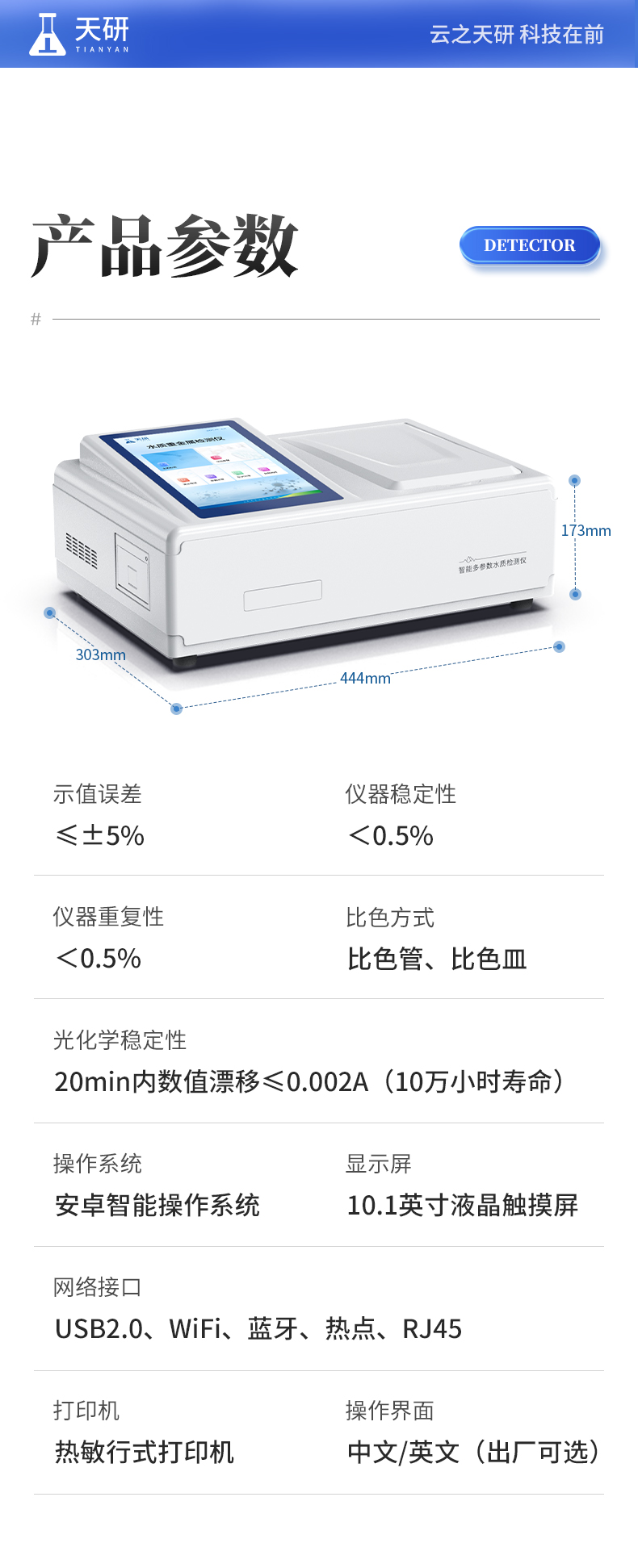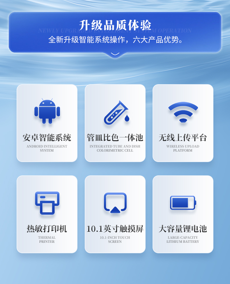 | 1、采用全新安卓7.1.1智能操作系統(tǒng),人性化中文操作界面,運(yùn)轉(zhuǎn)速度更快速,穩(wěn)定性更強(qiáng)。 | 2、10.1英寸液晶觸摸屏顯示,人性化中文操作界面,讀數(shù)直觀、簡(jiǎn)單。 | 3、采用精密比色池設(shè)計(jì),使用光源一致,可以解決由于光源誤差帶來的檢測(cè)結(jié)果誤差問題,檢測(cè)結(jié)果更加精準(zhǔn)。 | 4、光源采用進(jìn)口超高亮發(fā)光二極管,光源亮度可以自動(dòng)調(diào)節(jié)與校準(zhǔn)。 | 5、支持10mm、30mm、50mm皿比色和φ16mm管比色等比色方式,多元選擇,確保測(cè)量的準(zhǔn)確性; | 6、具有無線通訊功能,支持WIFI、RJ45、手機(jī)熱點(diǎn)聯(lián)網(wǎng)傳輸,檢測(cè)數(shù)據(jù)亦可通過U盤導(dǎo)出; | 7、多功能樣品管理,可對(duì)樣品進(jìn)行中英文命名,方便樣品記錄和數(shù)據(jù)存儲(chǔ); | 8、儀器可永久存儲(chǔ)800萬組數(shù)據(jù),為方便大量數(shù)據(jù)查找,可通過時(shí)間檢索,并隨意選擇分析; | 9、儀器帶有監(jiān)管云平臺(tái),數(shù)據(jù)可通過局域網(wǎng)和互聯(lián)網(wǎng)上傳,亦可對(duì)接上傳至環(huán)境監(jiān)管部門平臺(tái)。 | 10、內(nèi)置熱敏行式打印機(jī),打印紙上的內(nèi)容可自由選擇(包括二維碼打?。?/td> | 11、交流220V,可選配6ah大容量充電鋰電池,方便戶外流動(dòng)測(cè)試; | 12、后期產(chǎn)品固件可升級(jí)。 |