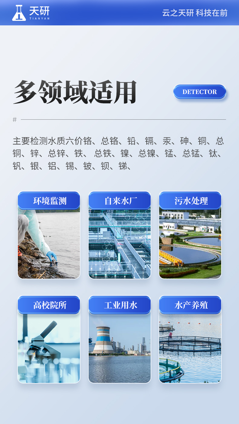 一、設(shè)備簡(jiǎn)介:多參數(shù)水質(zhì)重金屬檢測(cè)儀是完全參考國(guó)家標(biāo)準(zhǔn)、環(huán)境標(biāo)準(zhǔn)等相關(guān)標(biāo)準(zhǔn)設(shè)計(jì)制造,適用于國(guó)內(nèi)外眾多檢測(cè)標(biāo)準(zhǔn)。 主要檢測(cè)水質(zhì)六價(jià)鉻、總鉻、鉛、鎘、汞、砷、銅、總銅、鋅、總鋅、鐵、總鐵、鎳、總鎳、錳、總錳、鈦、釩、銀、鋁、錫、鈹、鋇、銻、鈷等重金屬含量指標(biāo);本儀器兼具智能數(shù)據(jù)分析功能,圖表、列表顯示數(shù)據(jù)