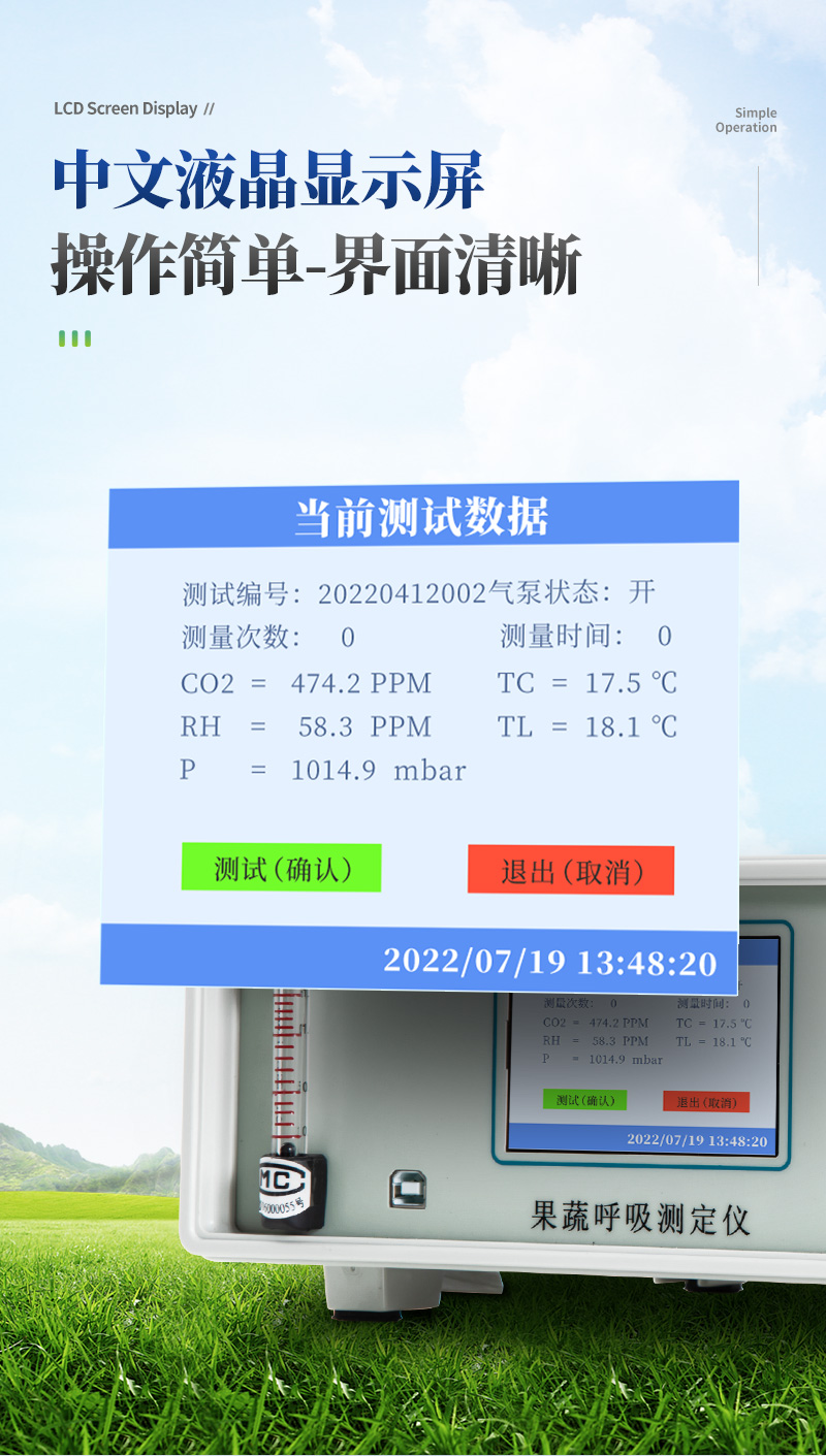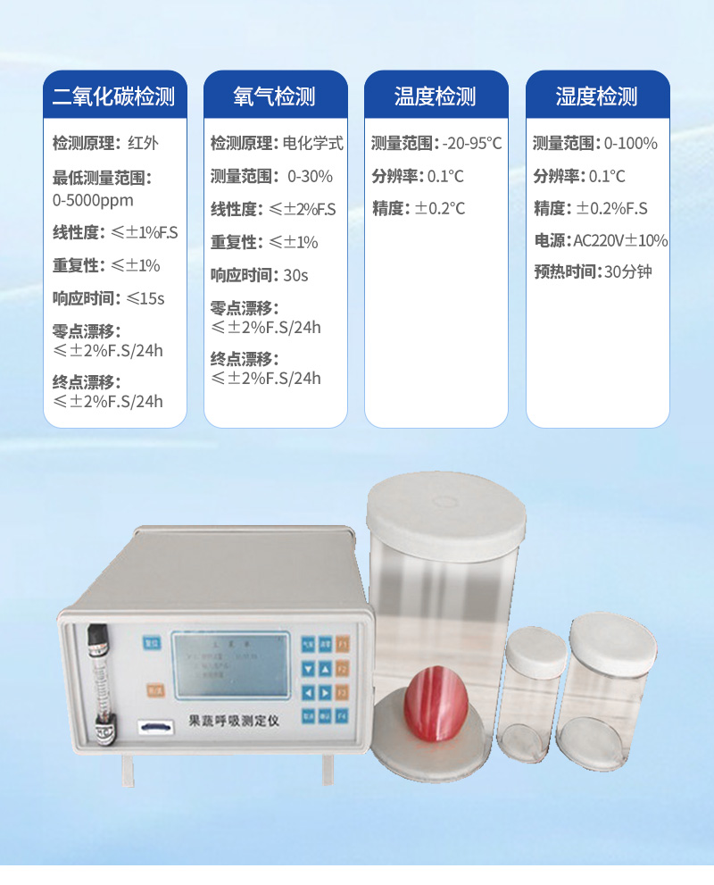 果蔬呼吸測(cè)定儀專門用于常溫、冷藏庫、氣調(diào)庫、超市冷柜等儲(chǔ)藏條件下的果品和蔬菜呼吸強(qiáng)度的測(cè)定和分析研究。該儀器的特點(diǎn)是可以根據(jù)果蔬的大小來選擇不同體積的呼吸室,加快了平衡和測(cè)定時(shí)間;可以同時(shí)顯示呼吸室的CO2濃度、O2濃度、溫度和濕度。該儀器具有多功能、高精度、快速、**、方便等特