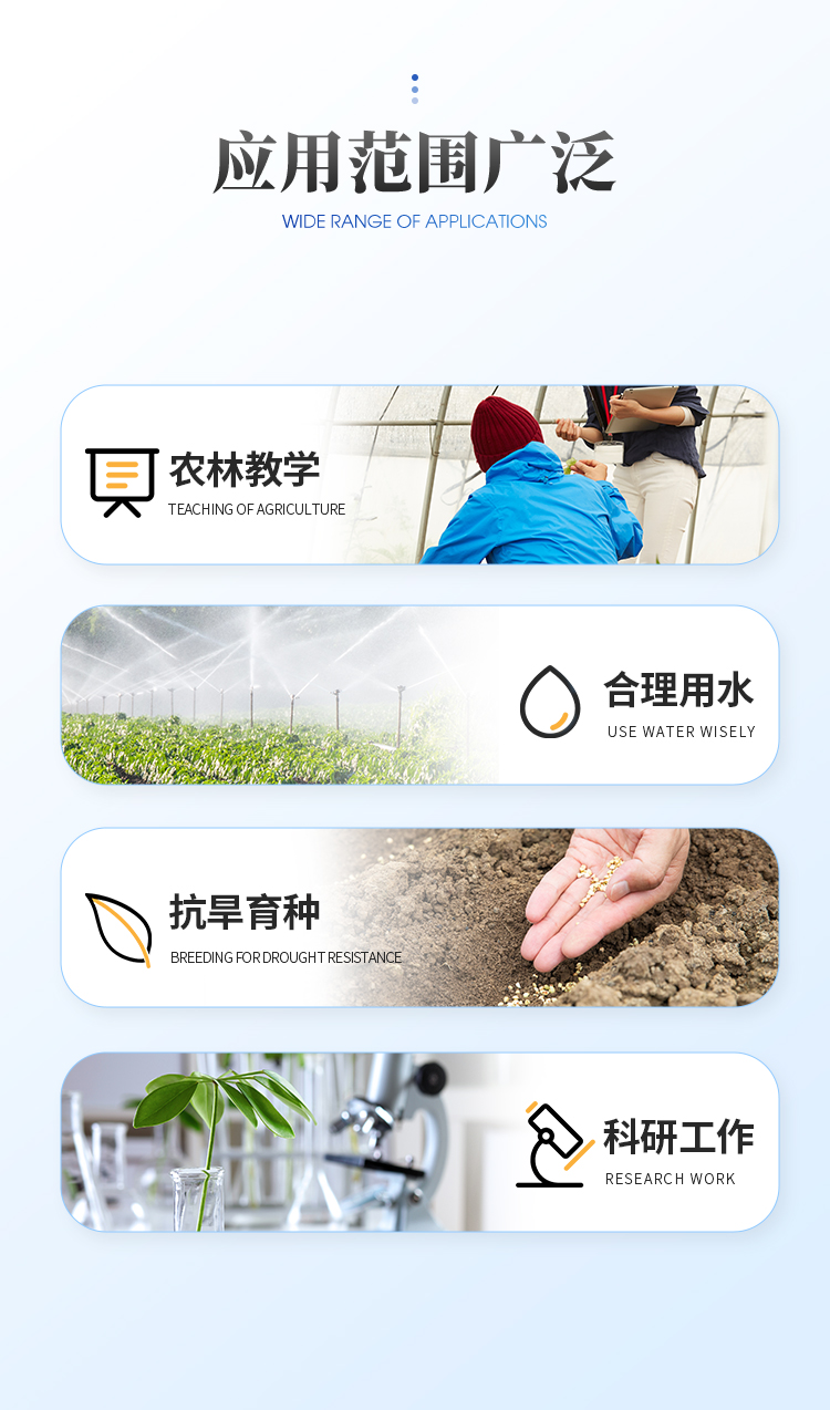 YT-ZWS1植物水勢測定儀是用于測定植物水分狀況和它的組成成分及壓去木質(zhì)部位導(dǎo)管汁液提供成分分析用的一種分析儀器。可以利用此儀器研究植物的水分關(guān)系和植物與環(huán)境的關(guān)系。該儀器適用于植物生理學(xué)、生態(tài)學(xué)、農(nóng)學(xué)、林學(xué)及牧草等的研究,可據(jù)此指導(dǎo)作物及林草的合理用水和抗旱育種等工作,是從事農(nóng)林教學(xué)和科研工作的重要儀器。