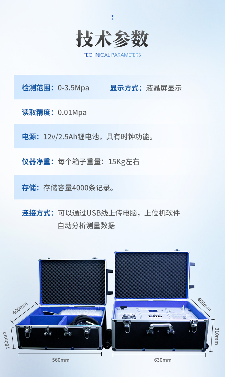 | 讀取精度:0.01Mpa | 電源:12v/2.5Ah鋰電池,具有時鐘功能 |