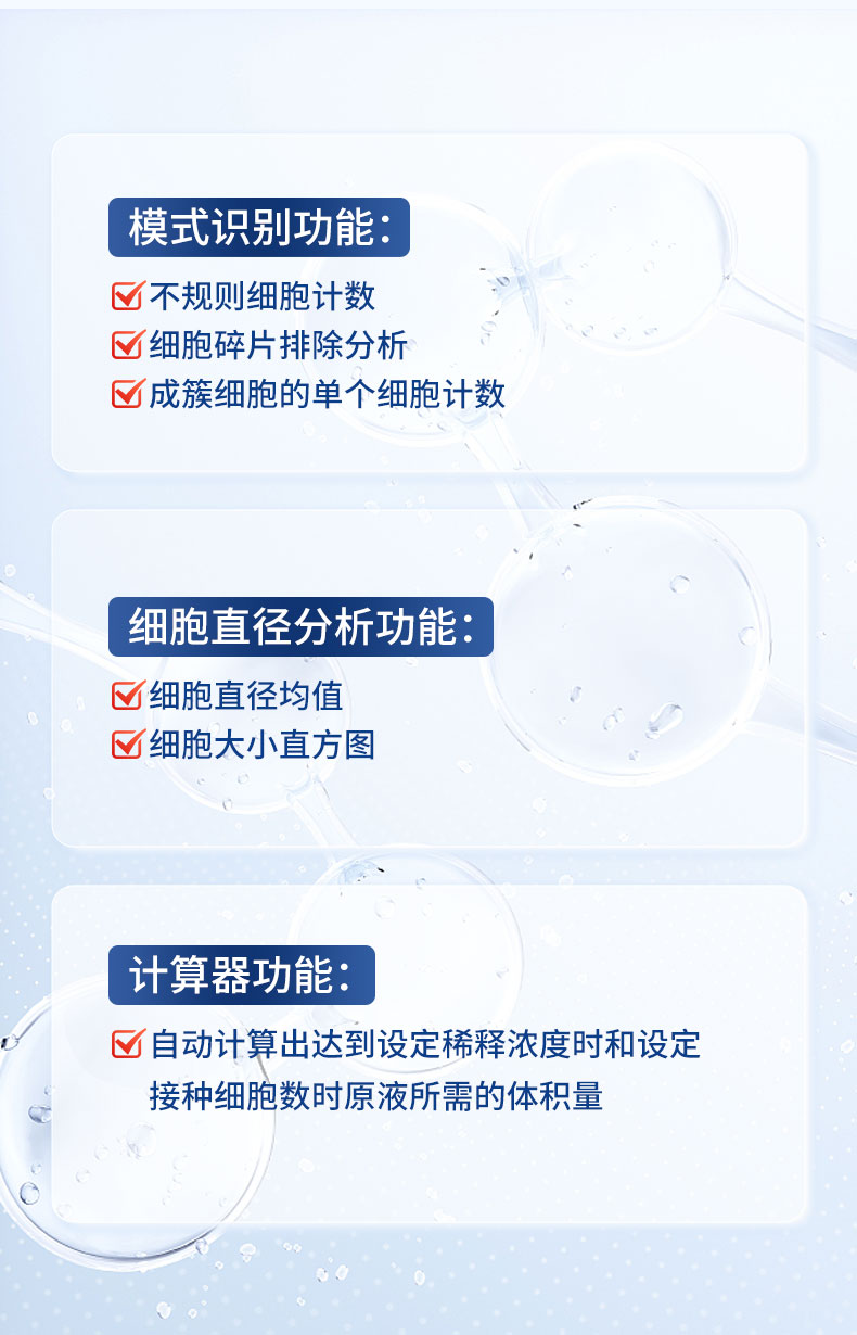 計數(shù)功能: 1、細(xì)胞總濃度和細(xì)胞總數(shù); 2、活細(xì)胞濃度和活細(xì)胞數(shù); 3、細(xì)胞存活率檢測(臺盼藍(lán)染色法); 模式識別功能: 1、細(xì)胞碎片排除分析; 2、成簇細(xì)胞的單個細(xì)胞計數(shù); 3、不規(guī)則細(xì)胞計數(shù); |