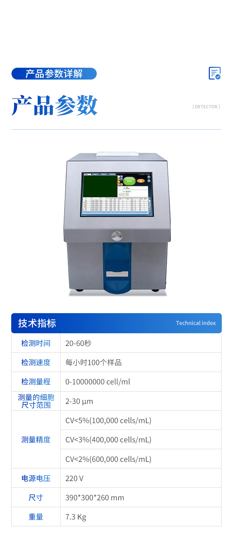 | 1、檢測時(shí)間:20-60秒; | 2、檢測速度:每小時(shí)100個(gè)樣品; | 3、檢測量程:0-10000000 cell/ml; | 4、測量的細(xì)胞尺寸范圍:2-30 μm; |