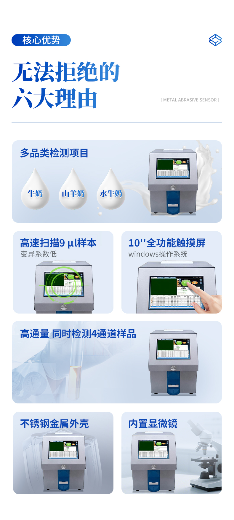 | 1、適用牛奶、羊奶、水牛奶等多種奶樣; 2、高速掃描9 μl樣本,變異系數(shù)低,結(jié)果精準(zhǔn)可靠; 3、高通量,同時(shí)檢測4通道樣品; 4、內(nèi)置顯微鏡,快速自動(dòng)對焦及細(xì)胞計(jì)數(shù)軟件,20-60秒即得結(jié)果; 5、嵌入圖像分析軟件,圖像顯示檢測結(jié)果,更直觀; | 6、無需校準(zhǔn),易維護(hù); 7、采用不銹鋼金屬外殼,設(shè)計(jì)緊湊便攜,節(jié)省空間; 8、采用10''全功能觸摸屏,windows操作系統(tǒng); 9、大容量內(nèi)存,且內(nèi)置打印機(jī),易于保存數(shù)據(jù); 10、提供軟件自動(dòng)更新和遠(yuǎn)程服務(wù); |