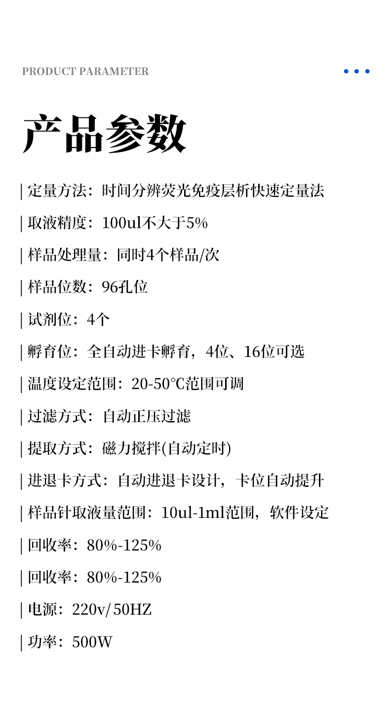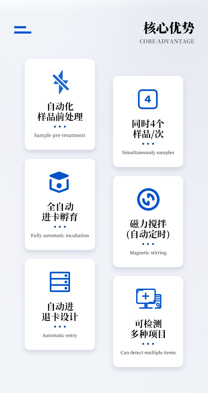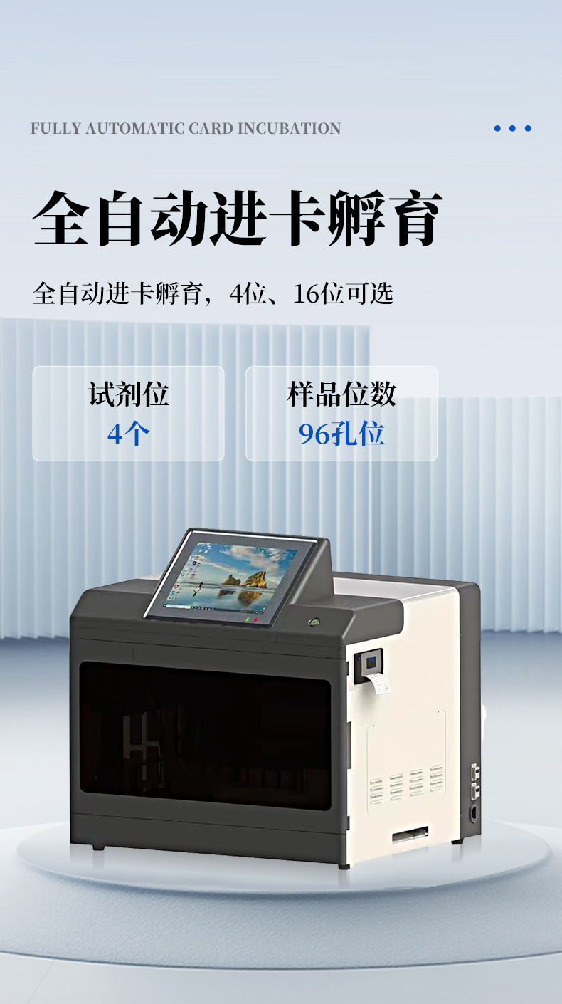 | 5、樣品位數(shù):96孔位; | 6、試劑位:4個(gè); | 7、孵育位:全自動(dòng)進(jìn)卡孵育,4位、16位可選; | 8、溫度設(shè)定范圍:20-50℃范圍可調(diào); |