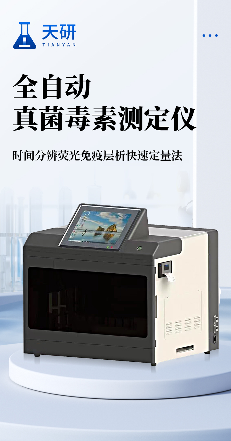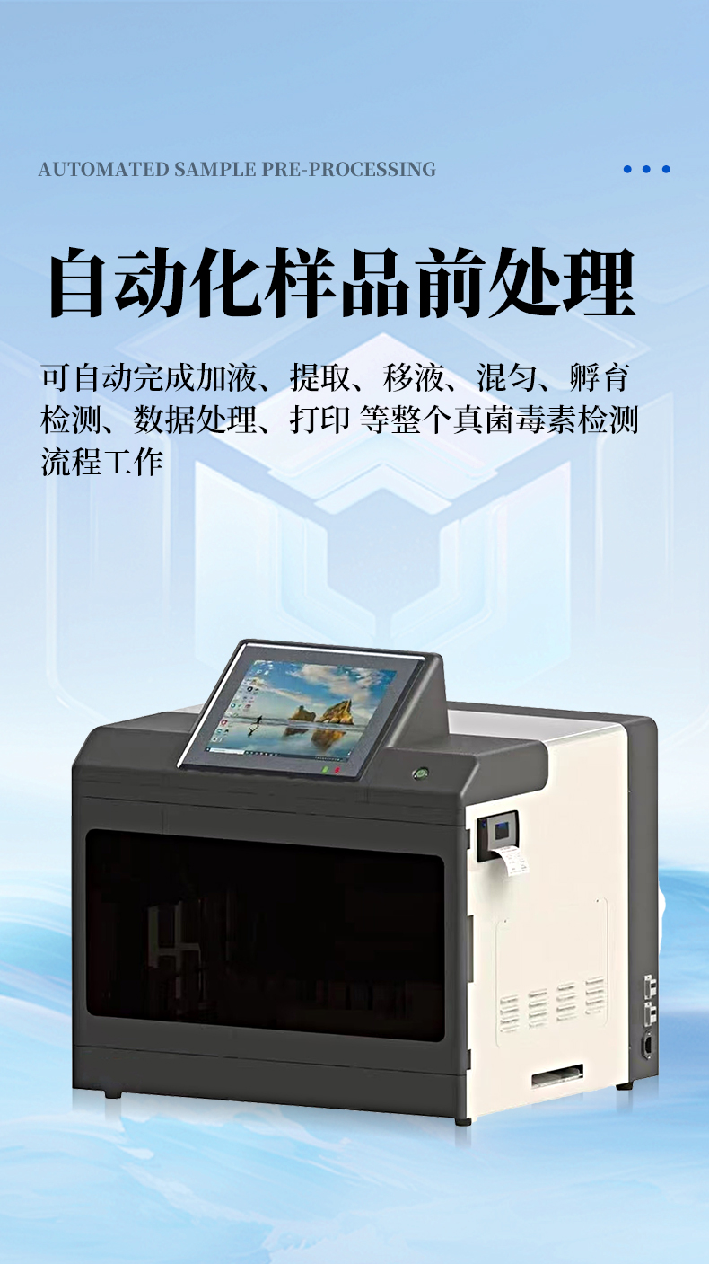 全自動(dòng)真菌毒素檢測(cè)儀簡(jiǎn)述: 本產(chǎn)品是以真菌毒素分析前處理技術(shù)開(kāi)發(fā)的全自動(dòng)檢測(cè)儀,可自動(dòng)完成提取、混勻、移液、孵育、檢測(cè)、數(shù)據(jù)處理、打印等全流程工作。該儀器基于光電檢測(cè)原理的免疫熒光檢測(cè)技術(shù),配套專(zhuān)用熒光免疫試劑,通過(guò)自動(dòng)化樣品前處理替代人工操作,可檢測(cè)黃曲霉B1、嘔吐毒素等多種