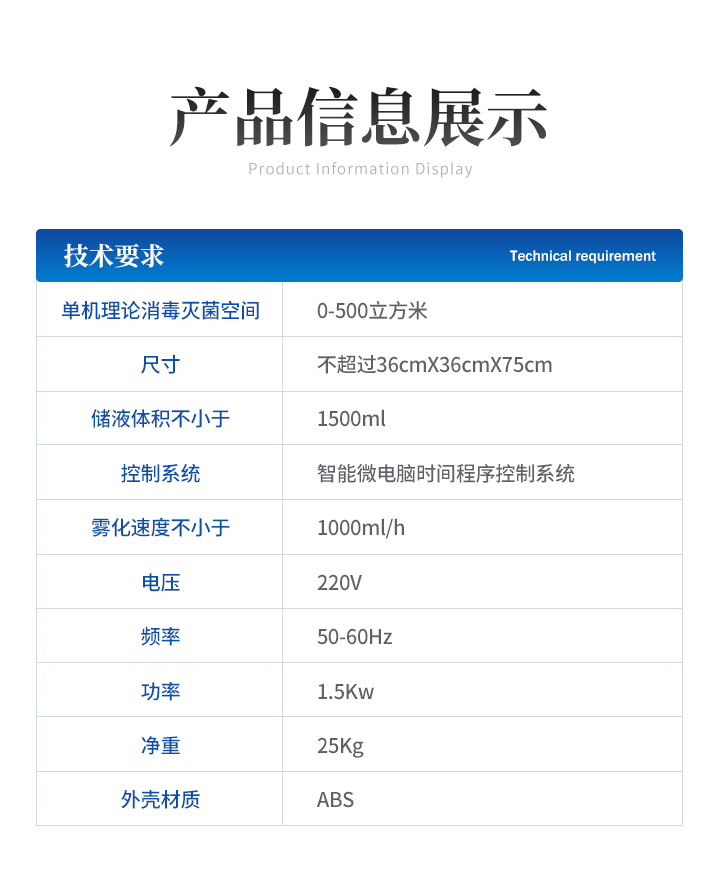 | 1、單機(jī)理論消毒滅菌空間:0-500立方米; | 2、尺寸:不超過36cmX36cmX75cm(長X寬X高,測(cè)量誤差±5cm); | 3、儲(chǔ)液體積不小于:1500ml; | 4、設(shè)備底部配有四個(gè)滑輪,設(shè)備可以輕松自由推動(dòng),方便移動(dòng); |