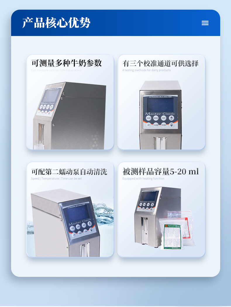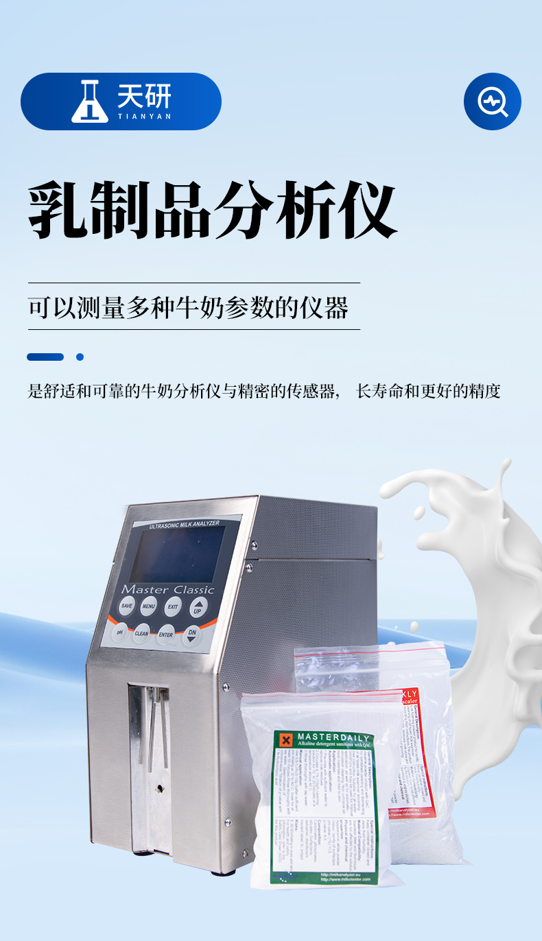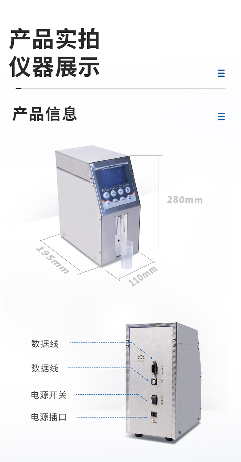 牛奶分析儀可配第二蠕動泵自動清洗。是舒適和可靠的牛奶分析儀與精密的傳感器, 長壽命和更好 的精度。有三個校準(zhǔn)通道可供選擇。牛奶分析儀的標(biāo)準(zhǔn)校準(zhǔn)適用于牛奶,羊奶,UHT。該分析儀還可以校準(zhǔn):水牛奶、 巴氏殺菌奶、 山羊奶、 混合奶、 脫脂奶、乳清等類型的牛奶和牛奶衍生物。