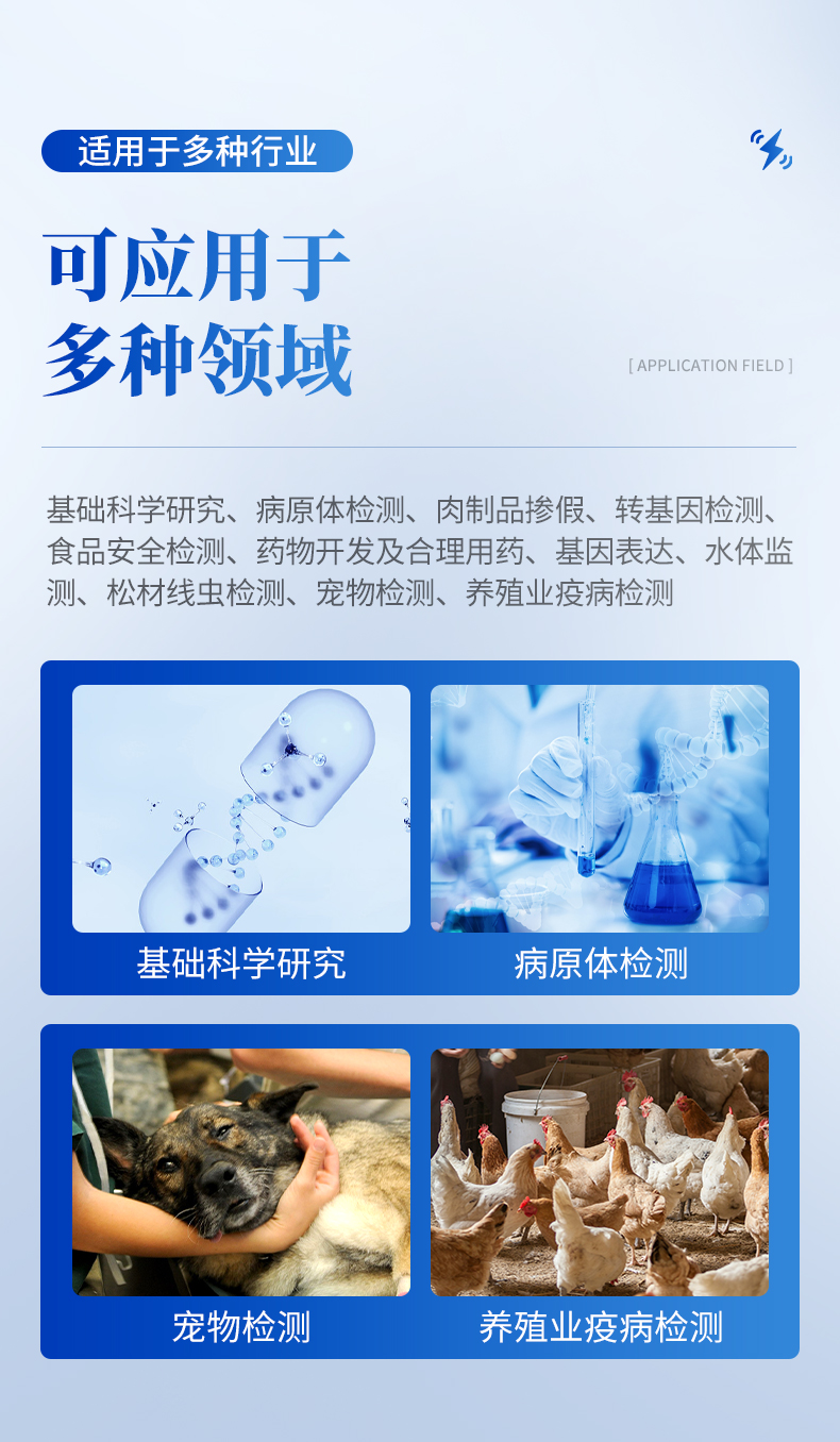 基礎(chǔ)科學(xué)研究、病原體檢測、寵物檢測、養(yǎng)殖業(yè)疫病檢測(牛羊、雞鴨鵝等禽類、魚蝦等水產(chǎn))
