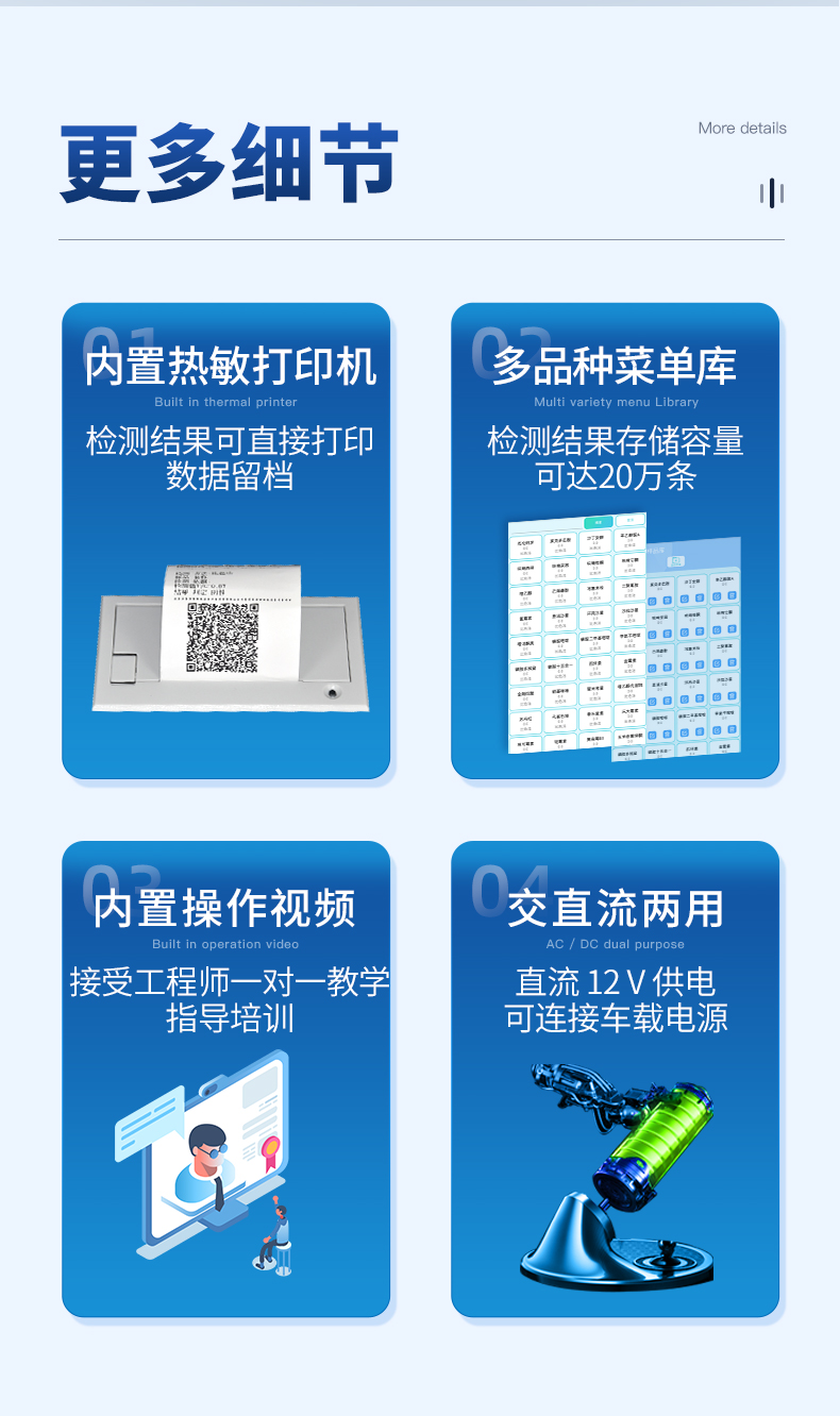 | 安卓智能操作系統(tǒng),采用更加**UI交互界面,儀器具有wifi聯(lián)網(wǎng)上傳、4G聯(lián)網(wǎng)傳輸、GPRS無線遠(yuǎn)傳、網(wǎng)線連接功能,快速批量上傳數(shù)據(jù)。 | 智能化程度高,儀器具有自檢功能:具有開機(jī)自檢和調(diào)零功能,具有自動(dòng)檢測重復(fù)性功能。 | 新一代高速熱敏打印機(jī),檢測完成可自動(dòng)打印檢測報(bào)告和二維碼。 | 儀器帶有監(jiān)管平臺(tái),數(shù)據(jù)可局域網(wǎng)和互聯(lián)網(wǎng)數(shù)據(jù)上傳,檢測結(jié)果直接傳至食品安全監(jiān)管平臺(tái)。進(jìn)行區(qū)域食品安全監(jiān)管及大數(shù)據(jù)分析處理與數(shù)據(jù)統(tǒng)計(jì),檢測區(qū)域食品安全長短期動(dòng)態(tài),達(dá)到食品安全問題預(yù)估、預(yù)警 | 一體化便攜式快檢設(shè)備,滿足現(xiàn)場及流動(dòng)檢測使用需求,能夠在同一軟件下實(shí)現(xiàn)所有檢測項(xiàng)目的檢測,并可通過同一窗口直觀顯示檢測結(jié)果。 | 膠體金模塊檢測方式:軌道式自動(dòng)傳輸掃描,檢測完成后自動(dòng)退出檢測卡。 | 一體化主機(jī),包含食品安全檢測模塊、多通道農(nóng)藥殘留檢測模塊、膠體金免疫層析檢測模塊。 | CT線自動(dòng)識別,無需手動(dòng)調(diào)整。 | 儀器具有品類多種類樣品菜單庫,可靈活選擇檢測樣品,不同的檢測通道可同時(shí)檢測不同的樣品項(xiàng)目。。 | 樣品處理簡單省力,整體操作快速、安全、便捷。 | 儀器具有自身保護(hù)功能,可設(shè)置用戶名及密碼,防止非工作人員操作等。 | 高靈敏度,高檢測精度,高重復(fù)性精度,掃描式高精度光學(xué)傳感器。 | 儀器具有重新校準(zhǔn)、鎖定、恢復(fù)出廠設(shè)置功能。 | 內(nèi)置強(qiáng)大的數(shù)據(jù)庫,可在儀器上直接選擇樣品名稱、檢測指標(biāo)、送檢單位等信息,也可在儀器上直接編輯錄入樣品名稱、檢測指標(biāo)、送檢單位等信息并保存進(jìn)樣品數(shù)據(jù)庫。 | 儀器具有重新校準(zhǔn)、鎖定、恢復(fù)出廠設(shè)置功能。 | 結(jié)果判定線可修改,對照值標(biāo)定值可保存,斷電不丟失數(shù)據(jù)。 | 兼容市場上所有的膠體金卡,使用耗材不受限制,極大增強(qiáng)用戶使用體驗(yàn)。 |